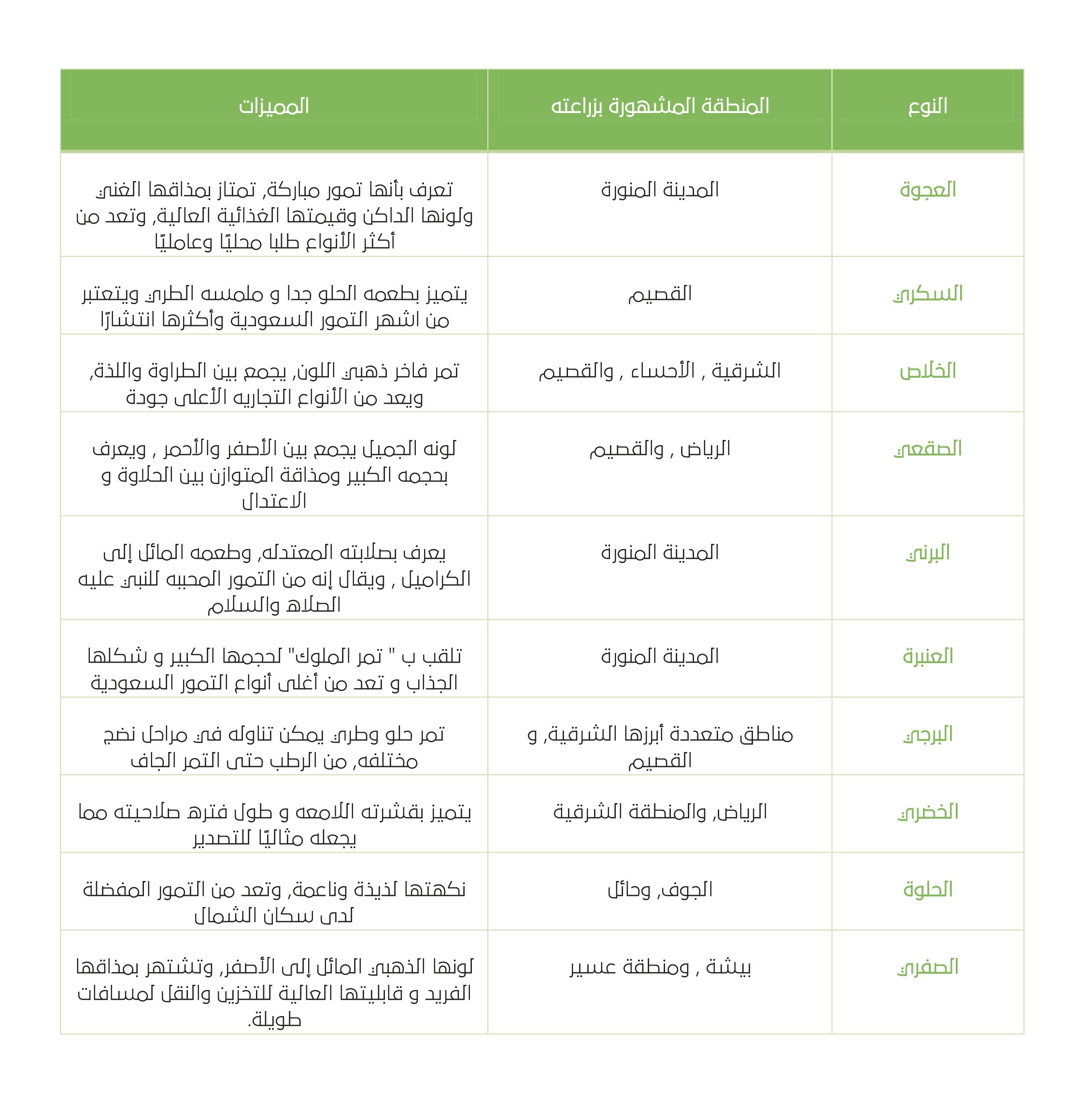 التمور السعوديه من أجود وأفخم أنواع التمور في العالم، حيث تمتاز المملكة ببيئتها المثالية لزراعة النخيل وجودة إنتاجها التي تجمع بين الأصالة والتطور الزراعي. تضم السعودية أكثر من 34 مليون نخلة تنتج نحو 300 صنف من التمور، وتشكل ما يقارب 17% من الإنتاج العالمي. وفيما يلي جدول يوضح أبرز انواع التمور في السعوديه ومناطق إنتاجها وأهم مميزاتها: